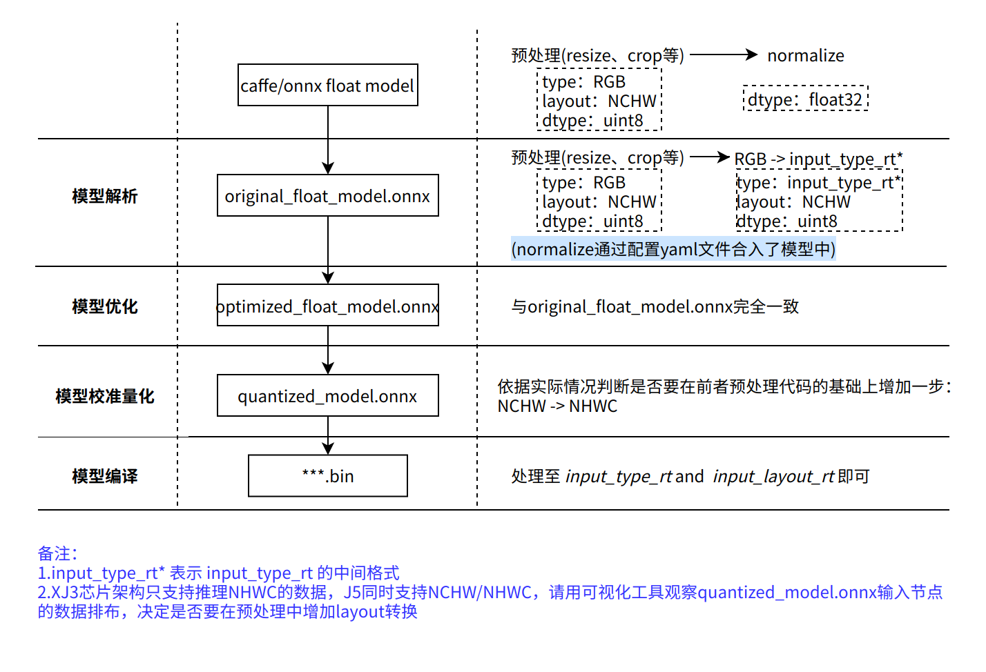 表格中第一行是 input_type_rt 指定的数据类型,第二行是特定 input_type_rt 对应的中间类型, 这个中间类型就是模型转换中间产物三个onnx模型的输入类型。每个类型解释如下: