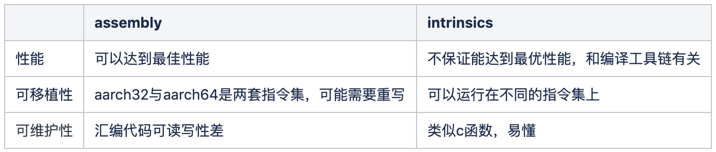 Neon intrinsics 函数为Neon操作提供C函数调用接口,编译器会将这些函数调用编译成相关的NEON指令。