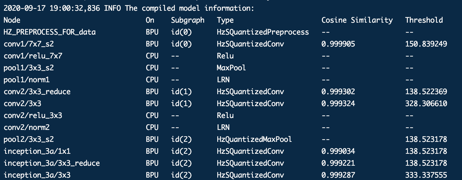 - 方案1:以下图 GoogleNet 为例,基于 1.1.16 及以后版本,我们在模型量化转换成功后,会在终端打印(也会保存在转换 log 文件中,方便以后查看)float 和 quanti 模型每一层卷积算子量化前后的向量余弦相似度。一般来说如果相似度低于 0.99,即反映了模型量化存在一定损失;如果相似度低于 0.8,那基本可以代表量化失败。