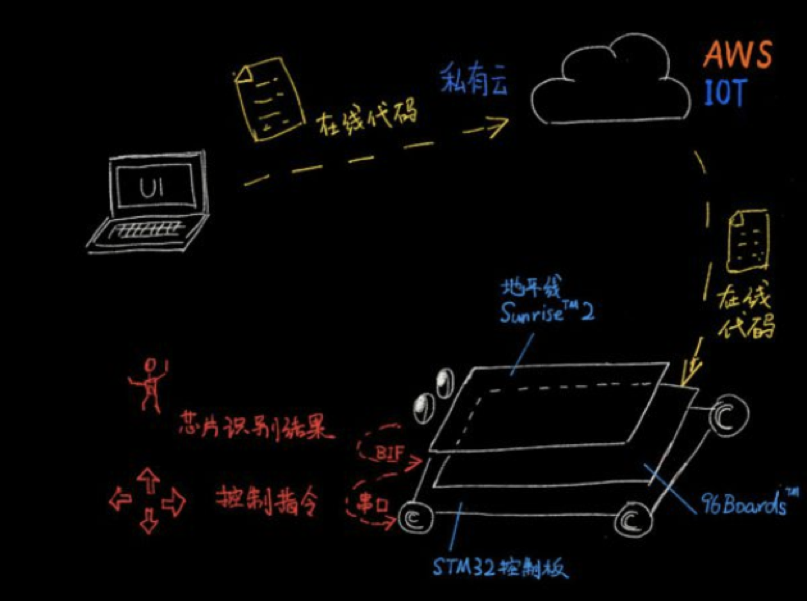 AI 开发板 通过 USB-to-MicroUSB 连接线连接小车控制核心板,核心板上使用 CH341芯片用于USB转串口信号向 STM32 发送控制信号。96Boards 侧 CH341 芯片被挂载为一个 USB 串口设备,软件层提供了简单的 python 库用于直接调用下发控制指令。