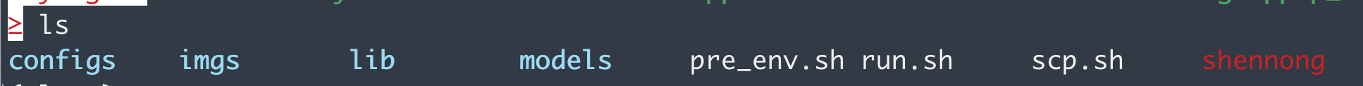 其中,configs是所有的配置文件,imgs是用于测试的图片,lib是所有的依赖库,pre_env.sh是环境初始化的脚本。shennong是可执行程序。