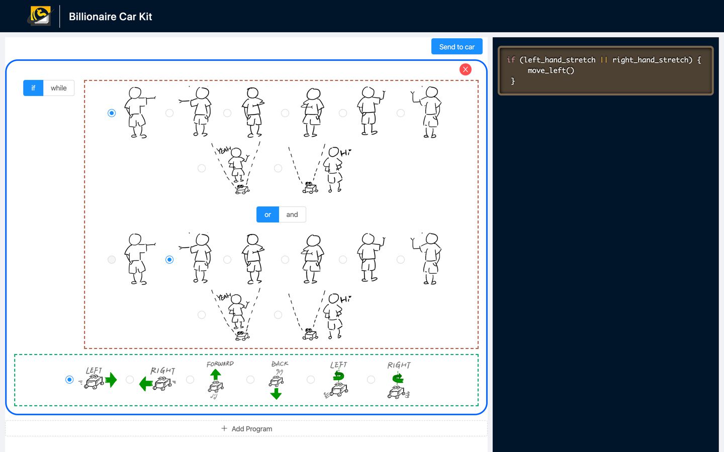 基于以上提供的解决方案,「三万块团队」提供了一套含有可视化编程界面的使用人体姿态控制小车的 Demo。通过在一个图形化的可编程界面,编程人员可以将人体姿态和小车行径对应,然后通过云端下发到小车,就能实时修改小车的反馈逻辑。在该 Demo 中,有多处都可自定义的地方,适用于多年龄段,多水平层次的人使用。如果是面对青少年编程学习,可以操作 Web 页面,作为逻辑运用和人工智能模块运作入门。如果是有编程能力的学生,可以修改开源的 Python 模块,增加不同的人体姿态判断逻辑或自定义更多行为模型。如果是深度爱好者,可以在 96Boards 上使用别的地平线算法模型,发展其他的应用逻辑。