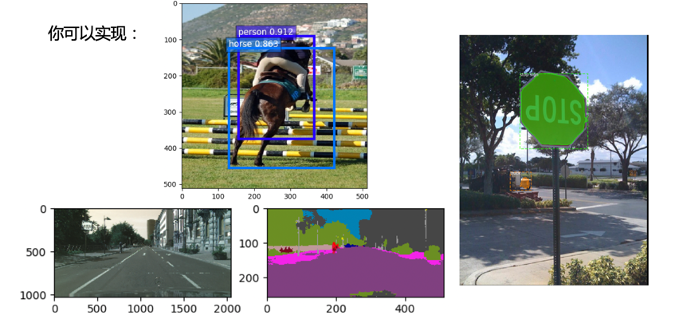 在这个部分,你将会了解到在96board上面你能够实现的算法功能(有:classification (分类),detection(检测),segmentation(分割), instance segmentation,示例如图1),训练能够在96board上面使用的模型需要的步骤(量化训练,模型编译),以及地平线为大家方便实现整个流程提供的工具。