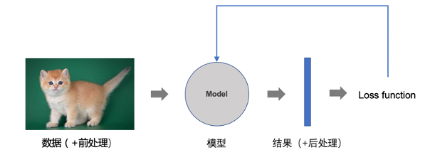 深度学习或者机器学习算法之所以成为学习,是因为他们能够去设置一个loss function,然后这对于这个loss function的结果对模型的参数进行调整,如图4. Loss function是使用预测结果和真实结果(ground truth)来计算一个损失,然后通过梯度下降的方法把损失往回传给网络的每一层,以此来更新模型参数。