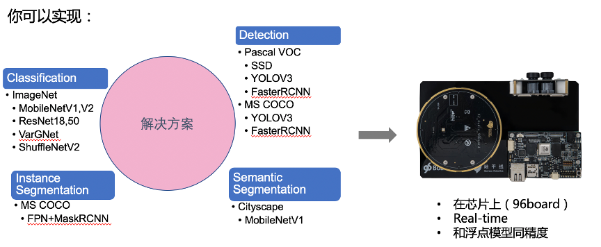 这里要引入一个概念,解决方案。解决方案就是地平线根据不同的算法功能提供的将环境搭建,模型搭建,算法实现,模型训练,模型编译都实现好,以及串在一起,进行数据和参数简单调整后就能够得到在96board上面使用的模型的工具和代码实现。使用地平线提供的算法解决方案,可以很容易地得到能够在96board上面跑的实时的,和GPU上面训练类似精度的模型。