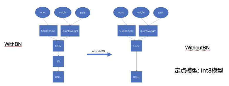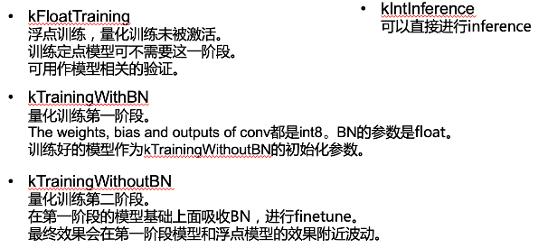 在我们讲解完量化训练之后,我们可以再回到我们在TensorFlow plugin中提供的五种mode。这里详细介绍其中四种mode,如图14。其中kFloatTraining mode就是一般在GPU上面使用的浮点训练方式,在定点模型训练中不是必要的步骤。kTrainingWithBN是刚刚我们提到的量化训练第一阶段。kTrainingWithouBN是刚刚我们提到的量化训练的第二阶段,吸收BN的参数,没有BN层的阶段。kIntInference是进行定点模型inference的mode。
