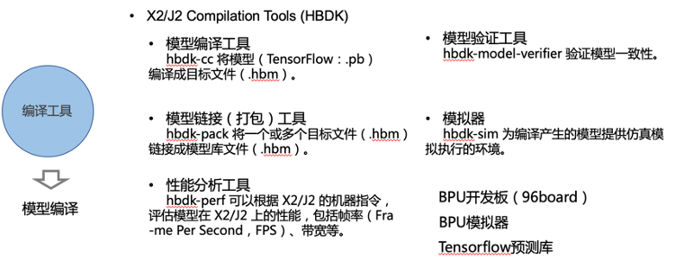 在模型训练完毕之后,我们会得到模型文件比如用TensorFlow进行训练的话会得到pb文件,用MXNet进行训练的话会得到params和json文件。有了这些文件之后我们需要用编译工具进行模型编译,得到能够在芯片上面使用的目标文件.hbm。这样的模型编译可以使用我们提供的编译工具X2/J2 Compilation Tools (HBDK)进行实现。我们的编译工具提供的功能如图15所示。