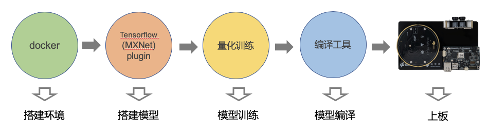 整体的开发流程workflow如图7所示,首先是环境搭建,可以使用我们提供的docker方便快捷在linux上面搭建环境。然后是模型搭建,可以使用我们提供的TensorFlow(MXNet) plugin。紧接着就是量化训练,使用我们推荐的量化模型训练流程,可以得到定点模型。最后是模型编译,使用我们提供的编译工具能够把模型转化为能够在96board上面使用的格式。