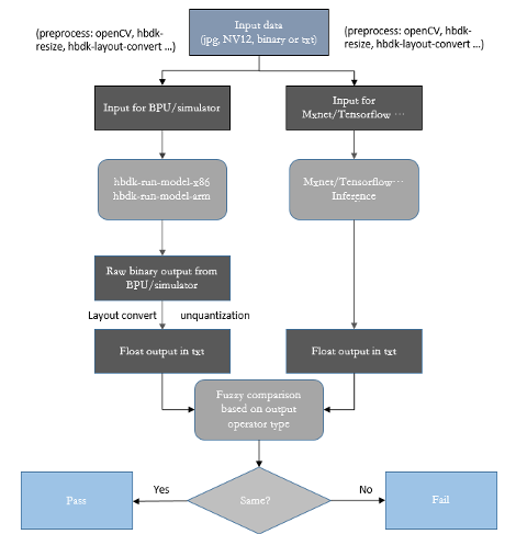 想到得到编译好的模型其实使用模型编译工具hbdk-cc就可以了,但是我们提供了很多其他功能,是因为在模型编译好之后的验证工作非常重要。要进行模型编译之后的验证工作,需要提前了解三个概念:BPU开发板,BPU模拟器和TensorFlow预测库。BPU开发板也就是我们使用的96board,搭载了我们的BPU芯片。BPU模拟器是模型编译工具提供的可以在PC上面模拟BPU开发板inference效果的模拟器。TensorFlow预测库就是在X86上面能够使用的可以进行定点模型inference的预测库。我们编译好的模型验证方式就是比对这三种平台上面输出的结果(相同输入输出数值)是否一致,如图16(BPU对应BPU开发板,simulator对应BPU模拟器)。如果一致,那么模型编译就没有问题,编译好的模型可以上板使用。如果不一致,那么其中可能某些环节产生了问题,可能存在bug,需要反馈给我们的技术支持人员进行调试。