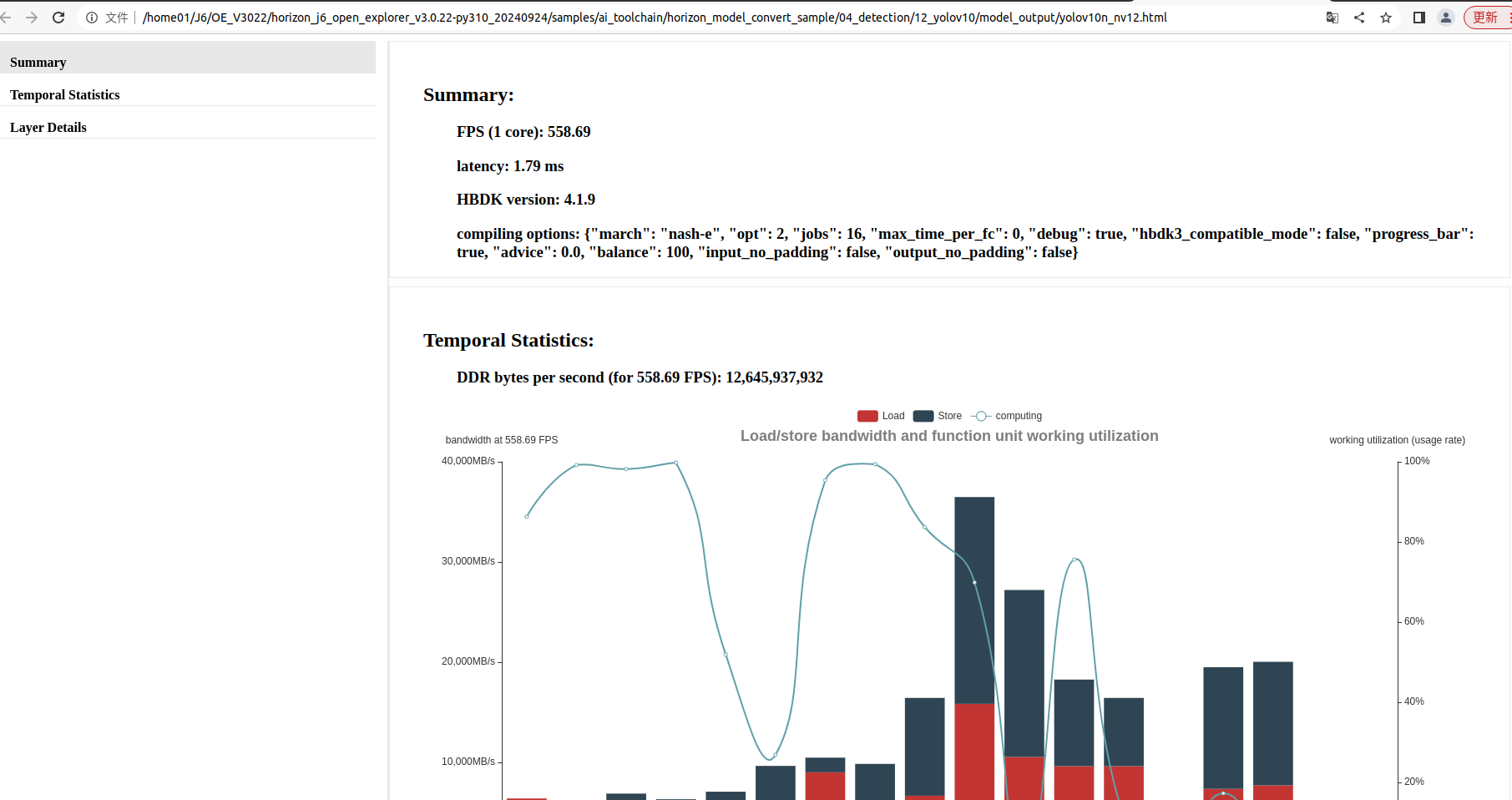 生成包含模型静态性能预估的html和json文件,两者内容相同, 但html文件的可读性更好,如下图。