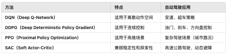 - Waymo & Tesla:采用 DDPG/PPO 进行端到端驾驶策略优化。