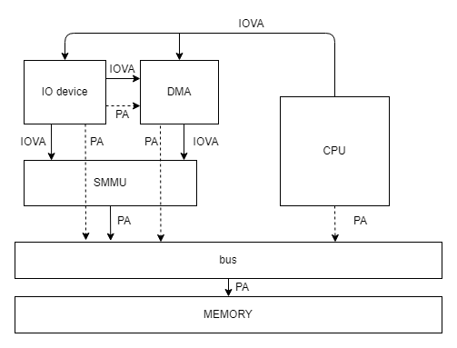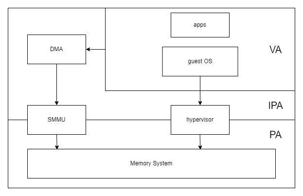 SMMU有两个主要的作用,一个是通过地址映射,使得离散的物理地址映射成连续的虚拟地址,这样设备就可利用DMA直接进行访问,此时配置到DMA控制器的地址变为IOVA,所以对于DMA控制器来说,地址也是连续的;另一个作用是虚拟化,SMMU实现DMA的地址隔离与转换,将guest OS使用的IPA地址映射到PA,实现连续内存的分配。