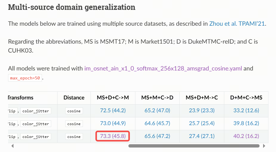 使用Multi-source domain generalization章节osnet_ain_x1_0的MS+D+C->M权重osnet_ain_ms_d_c.pth.tar。