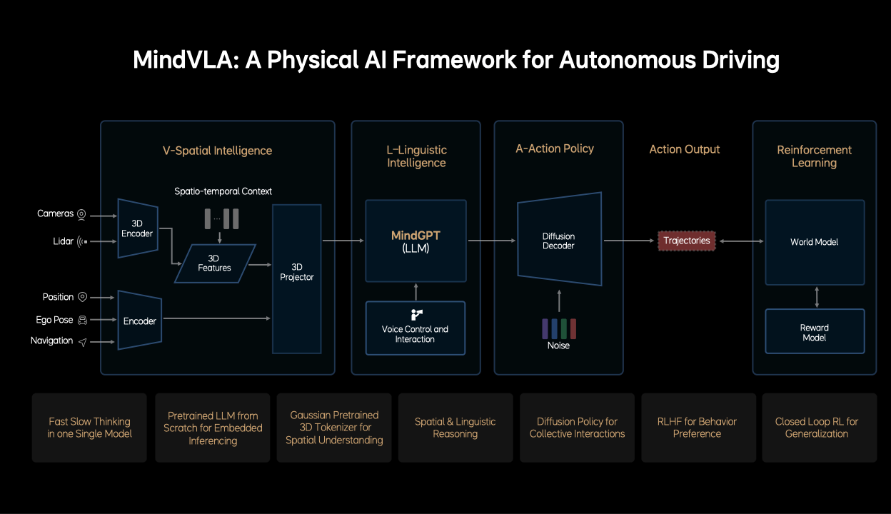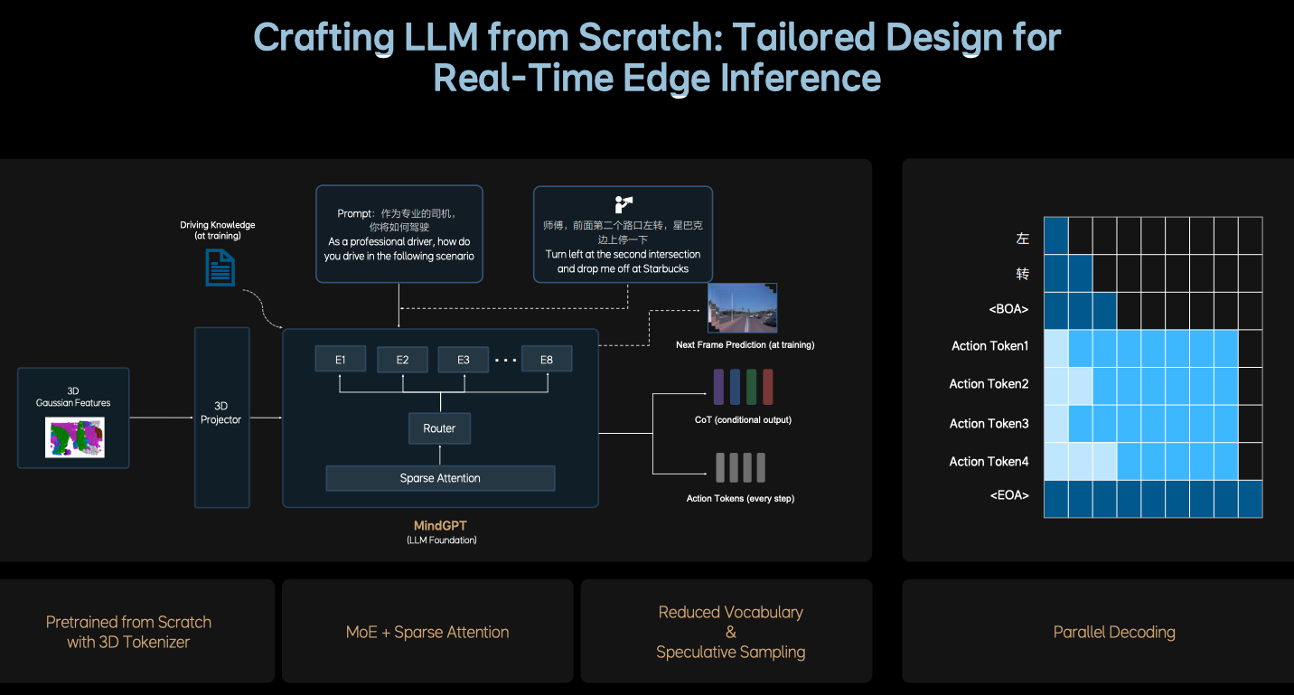 - 语言智能模块:嵌入式部署的大语言模型MindGP,用于空间 + 语言的联合推理,支持语音指令和反馈,可能实现人车交互。