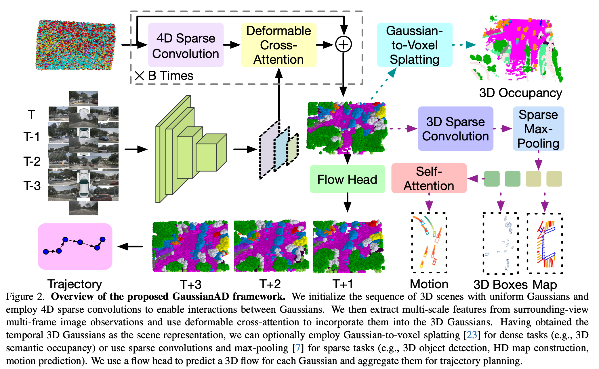 GaussianAD用均匀的高斯序列初始化3D场景,并使用4D稀疏卷积来实现高斯之间的交互。然后从环视多帧图像提取多尺度特征,并使用可变形的交叉注意力将它们纳入3D高斯。在获得时间3D高斯作为场景表示后,可以选择使用对密集任务的高斯到体素splatting(例如,3D语义占用),或者使用稀疏卷积和最大池化进行稀疏任务(例如,3D目标检测、高清地图构建、运动预测)。GaussianAD使用flow头来预测每个高斯的3D流,并将其汇总用于轨迹规划。
