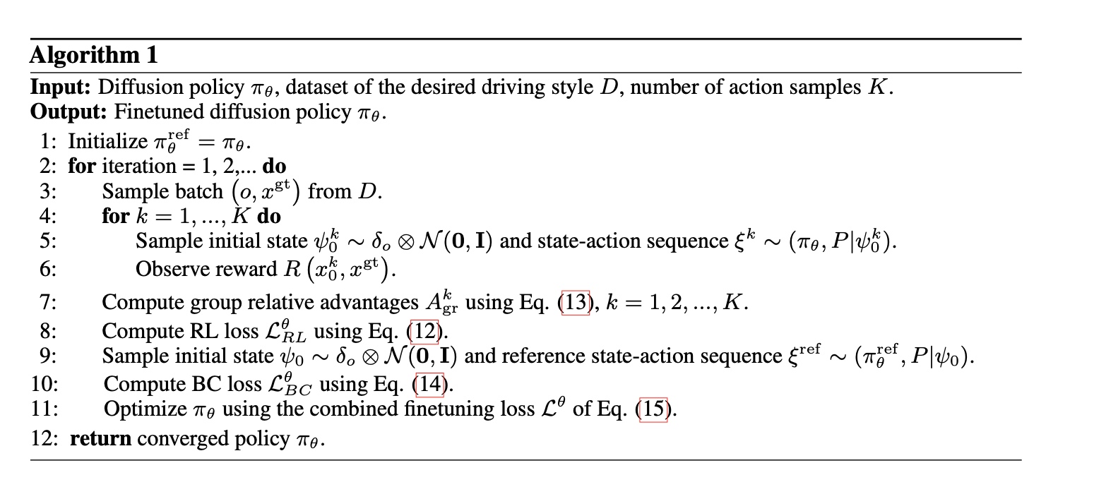 多模态生成与约束平衡:结合扩散模型生成多样化候选轨迹,通过强化学习微调对齐偏好,同时用行为克隆(BC)损失保留基础驾驶能力。