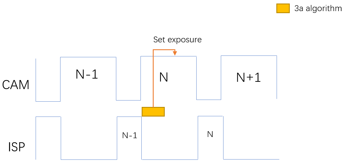 在N+1帧frame start中,去通知寄存器更新线程,从AE结果数组中取出N-1帧的计算结果,并设置到sensor寄存器里面,N+2帧寄存器生效。