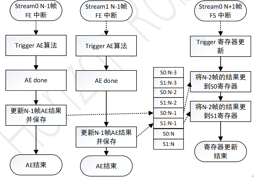 在N-1帧FE中断中,去通知AE算法,N-1帧已就位,AE算法开始运行计算;