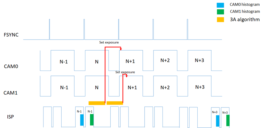 单camera场景,N-1帧统计数据在N帧时序内完成计算,并把AE结果设置到camera sensor寄存器上;camera sensor拥有global hold机制,可确保跨帧设置寄存器能在同一帧timing生效;一般情况下,该场景下,AE更新机制被称为N+2有效机制;