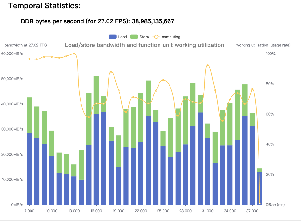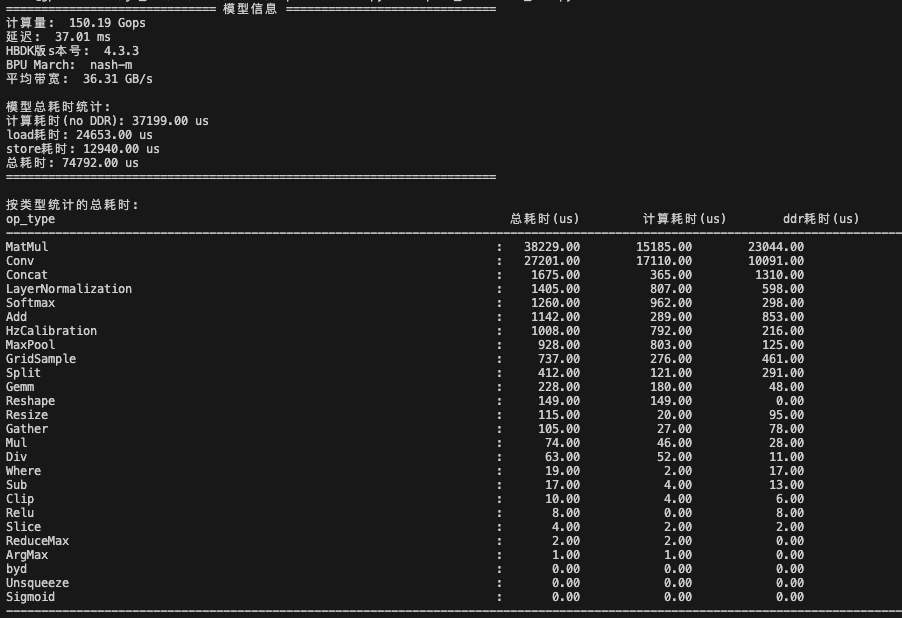 每种算子的总耗时、计算耗时和ddr耗时,有利于了解模型中算子的耗时分布和带宽占用;