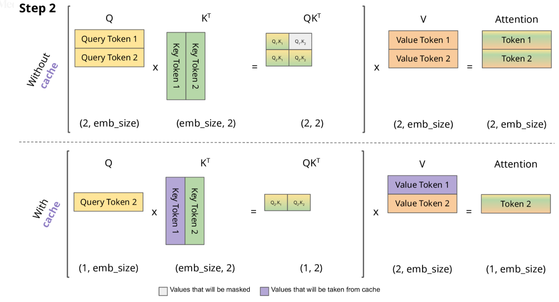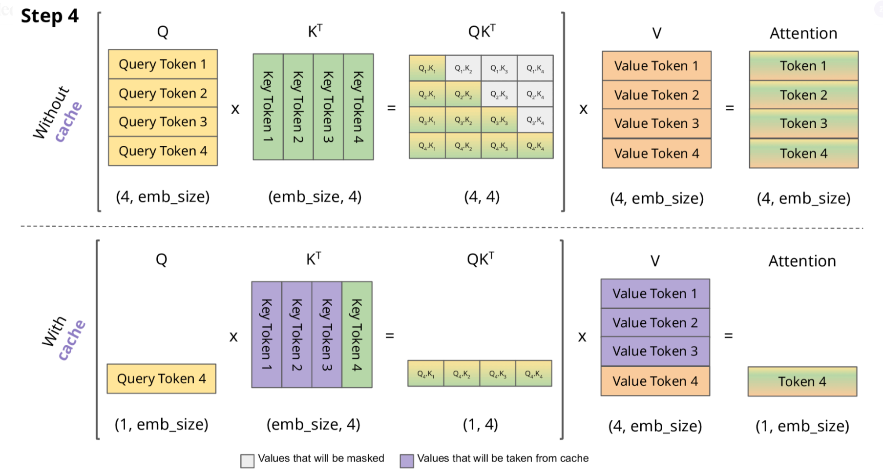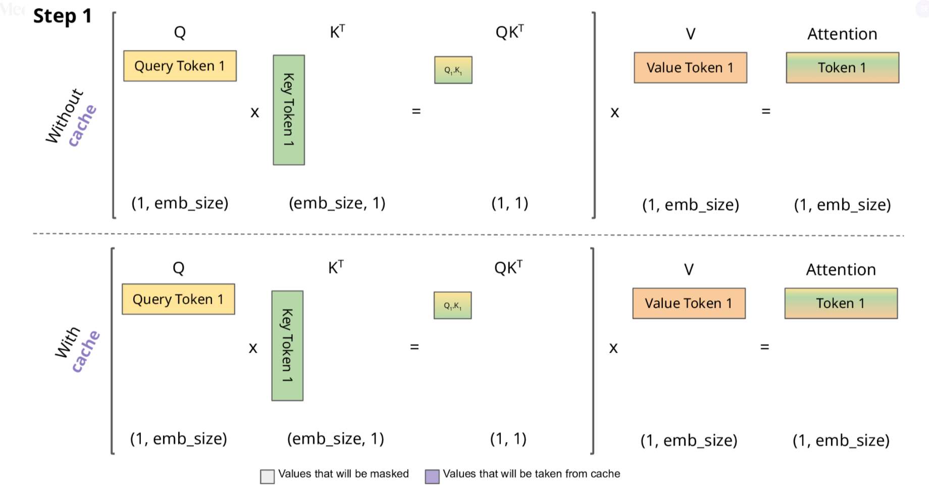 - 只需计算 新 token 的 K 和 V,然后将其与缓存的值结合使用。