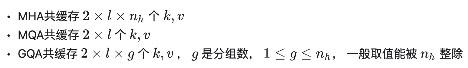 GQA是平衡了MQA和MHA的一种折中的方法,不是每个Head一个KV,也不是所有Head共享一个KV,而是对所有Head分组,比如分组数为 g ,那么每组: n_h/g个Head 共享一个KV。当 g=1 时,GQA就等价于MQA,当 g=n_h时, GQA就等价于MHA。