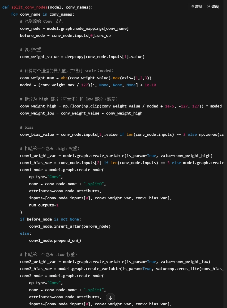 这段实现展示了一种Conv算子拆分技巧模拟双int16输入: