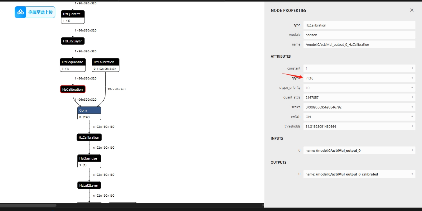 在 PTQ量化模型的过程中,往往存在一些敏感节点,如Conv算子,matmul算子等,我们通常倾向于将其设定为高精度的int16输入。但由于硬件原因限制,即使指定Conv算子的精度为int16,但实际指定结果是只有其中一个以int16精度输入,另一个仍然是int8,例如激活是int16.而权重weight是int8.如下图所示: