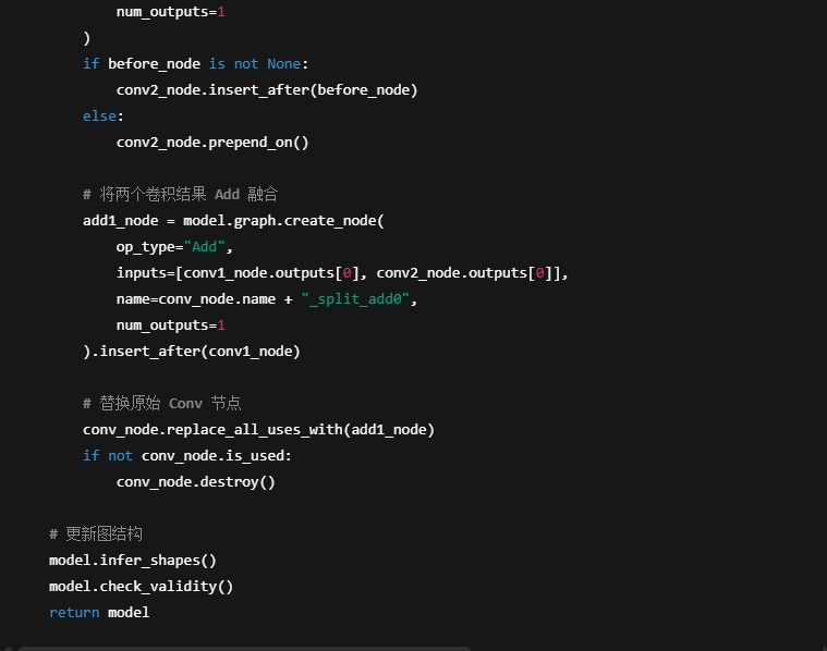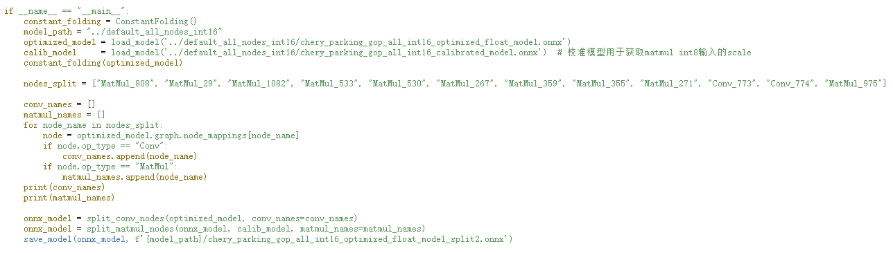 可以看到需要定义需要拆分的原始模型和算子列表,需要注意被拆分的原始模型需要选择ptq输出目录下的optimized的模型,至于敏感算子的信息可通过精度debug工具的get_sensitivity_of_node获取( debug工具的使用可自行查看用户手册,这里不赘述)。算子拆分后会生成新的onnx模型,可以将之作为ptq流程的原始模型进行输入,再次校准转化查看拆分效果。
