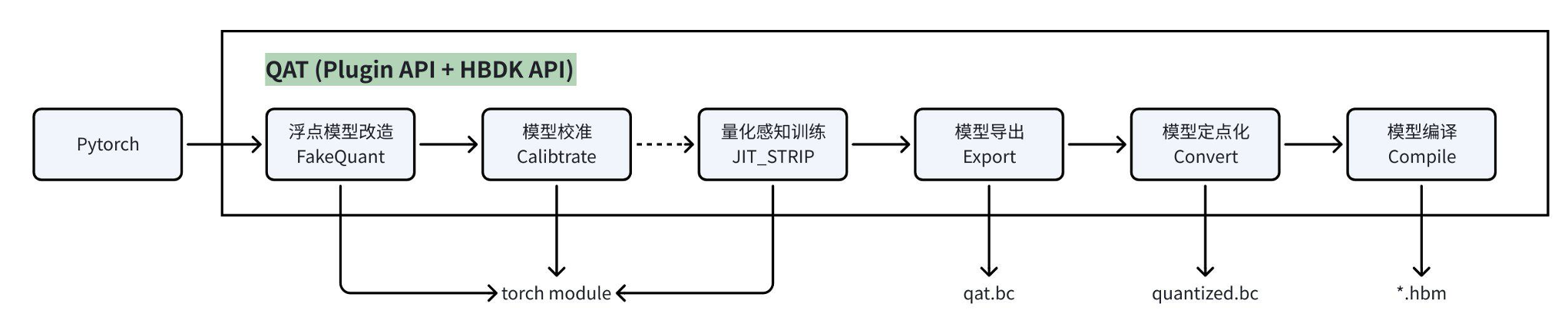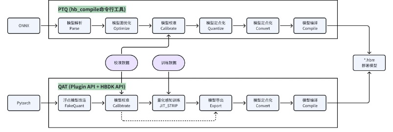 - QAT:在 PyTorch 开源框架上,基于 plugin 插件的形式提供模型量化能力,并调用 hbdk 编译器的 API 实现模型的定点化和编译。该链路支持模型校准后进一步的 finetune 训练,虽然上手难度和训练成本都较高,但精度上限也更高,更利于模型迭代优化,是量产项目中的更优选择。