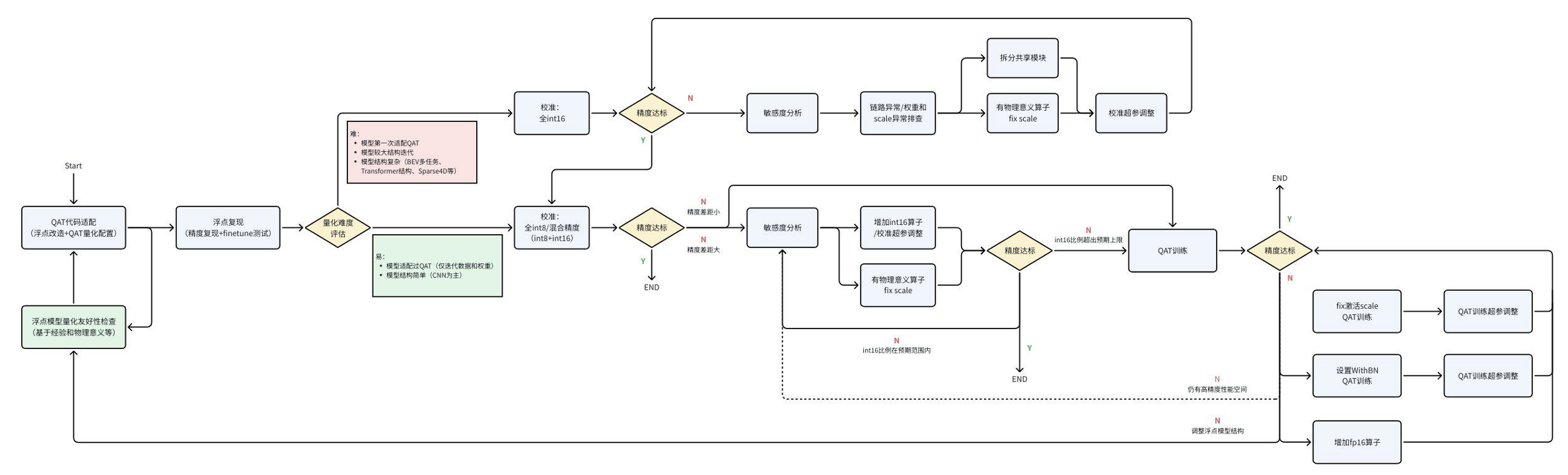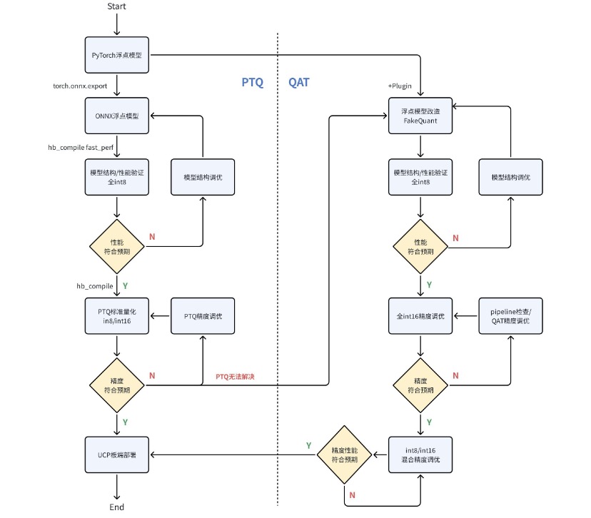 - Step2:如果遇到 PTQ 无法解决的精度 corner case,则需要转到 QAT 链路进行量化。依然建议先进行模型结构验证和全 int8 性能上限验证;若该性能符合预期,则优先在全 int16 配置下将精度训练至符合预期,然后再降低 int16 比例,实现 int8/int16 混合精度下的性能/精度调优,最终进行板端部署。
