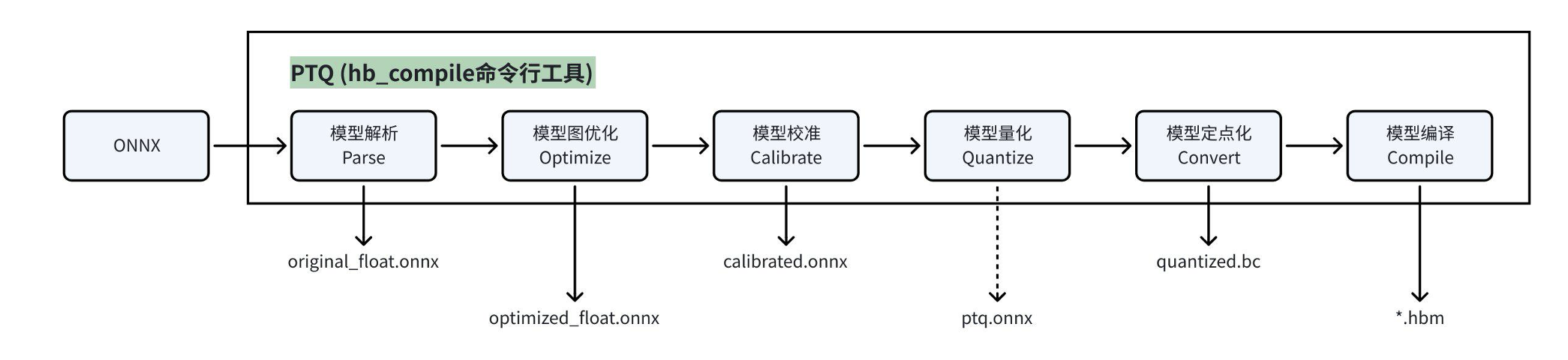 - PTQ:J6 工具链基于horizon_tc_ui 包封装的 hb_compile 命令行工具,提供 ONNX 模型 PTQ 全流程转换能力,其内部会先调用 hmct 包实现模型解析、图优化、校准功能,再调用 hbdk4_compiler 包实现模型的定点化和编译功能;
