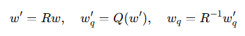 其中,w 为原始权重,w′ 为经过旋转变换后的权重,$$w'_q$$为量化后的权重,$$w_q$$ 为最终的量化权重。