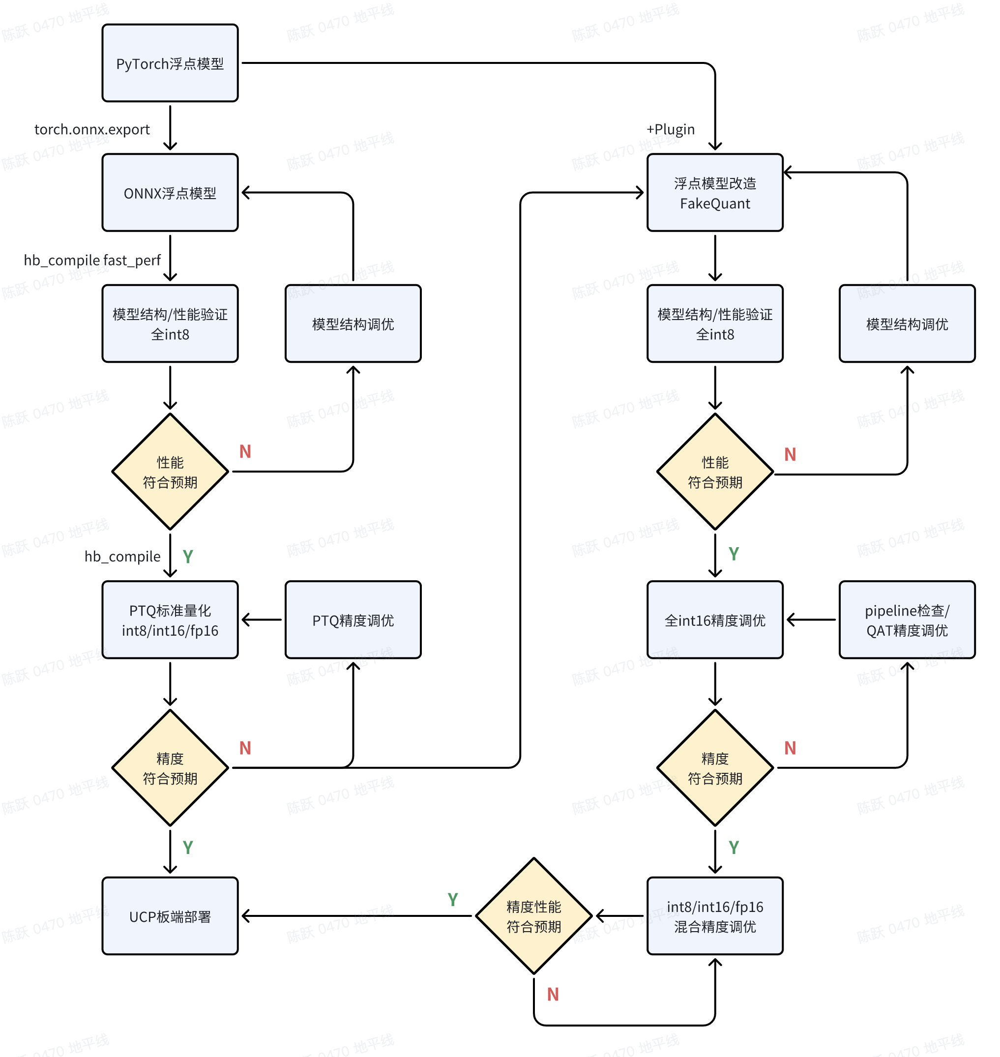 - Step1:先导出浮点 ONNX 模型(opset10~19),并基于 PTQ 链路进行快速的模型结构验证,全 int8 性能上限验证;若该性能符合预期,则可以精调 PTQ,若最终精度/精度都可同时满足预期,则可进行板端部署。
