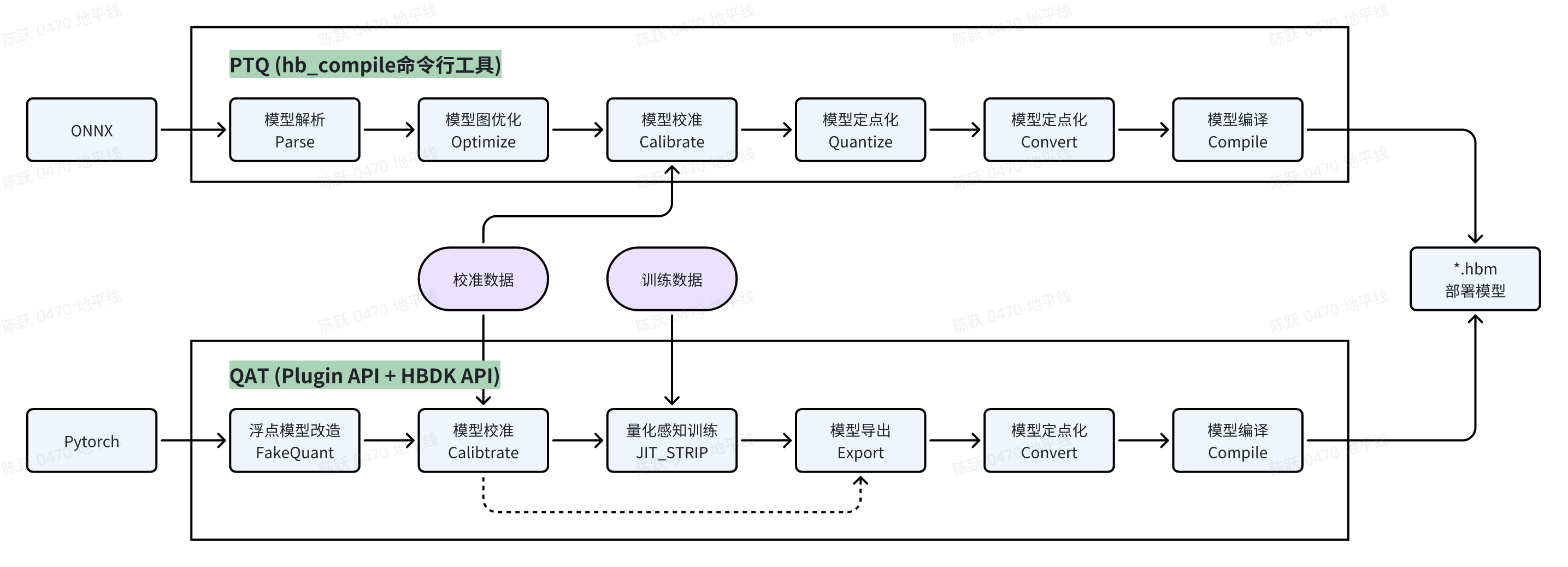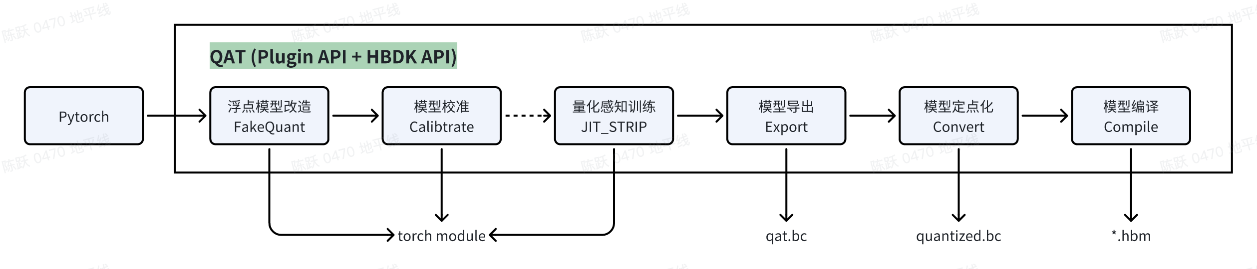 - QAT:在 PyTorch 开源框架上,基于 plugin 插件的形式提供模型量化能力,并调用 hbdk 编译器的 API 实现模型的定点化和编译。该链路支持模型校准后进一步的 finetune 训练,虽然上手难度和训练成本都较高,但精度上限也更高,更利于模型迭代优化,是量产项目中的更优选择。