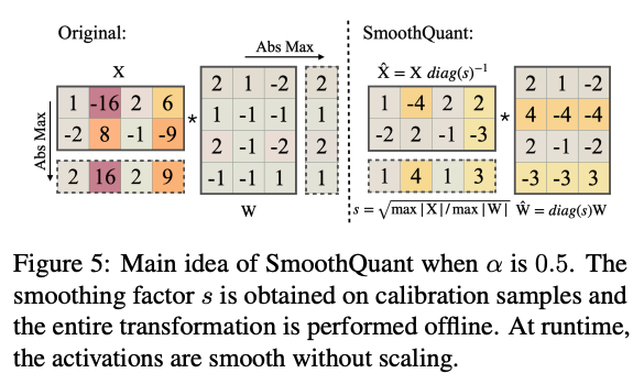 考虑到输入 𝐗 通常是由先前的线性操作(例如 、线性层、层归一化等 )产生的,可以轻松地将平滑因子融合到先前层的参数中 离线,这不会因额外的缩放而产生内核调用开销。 对于其他一些情况,当输入来自残差输入时,可以在残差分支中添加额外的缩放。