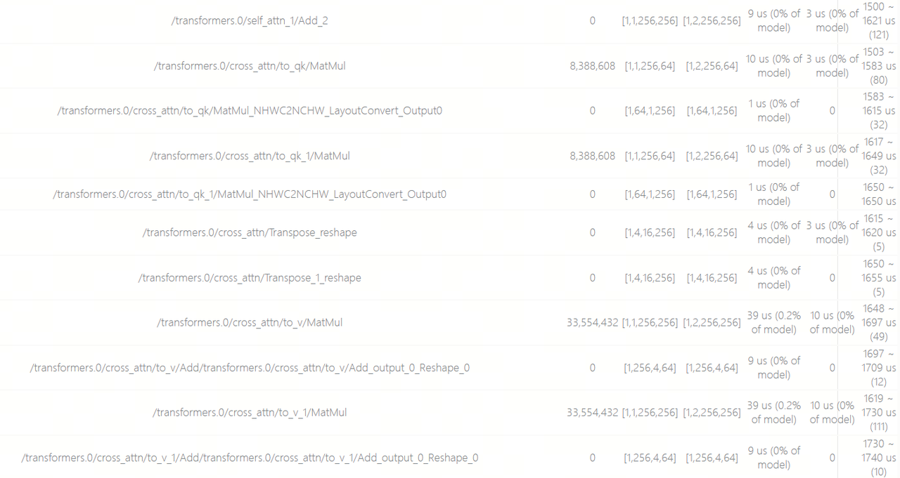 使用fast-perf编译优化后的模型,得到html静态性能分析报告,查看CrossAttention中的算子预估耗时,发现原本200us以上的Reshape操作已经消失,且所有数据搬运类算子均没有额外的BPU硬件对齐。现在的Reshape和Transpose算子均只有很轻微的耗时。