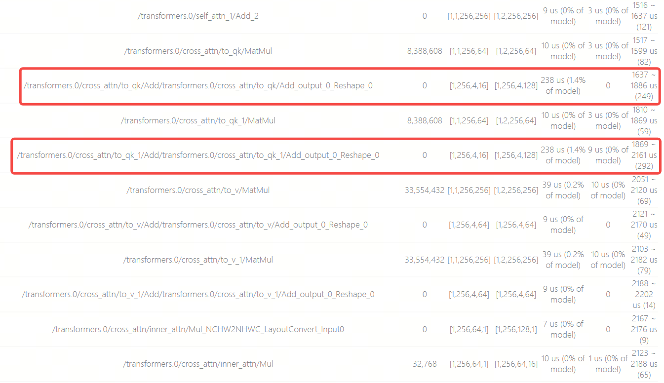 通过算子耗时预估发现,在每个CrossAttention结构的开头,有两个Matmul算子各跟随一个Reshape,这两个Reshape的最后一维度会从16 Padding到128,导致需要耗费共485us,占模型总耗时的2.8%,该模型一共有5个CrossAttention结构,这10个Reshape一共耗时2.4ms,约占总耗时的14%,需要优化。