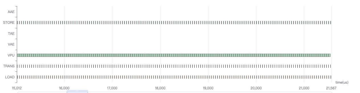如上图所示,有部分结构computing折线较低的地方,load/store开销也不大,观察时序图可发现是vpu器件运行时间太长,与TAE并行度不高,此时要想办法减少vpu上的计算,挪到其他器件上或者直接去掉。