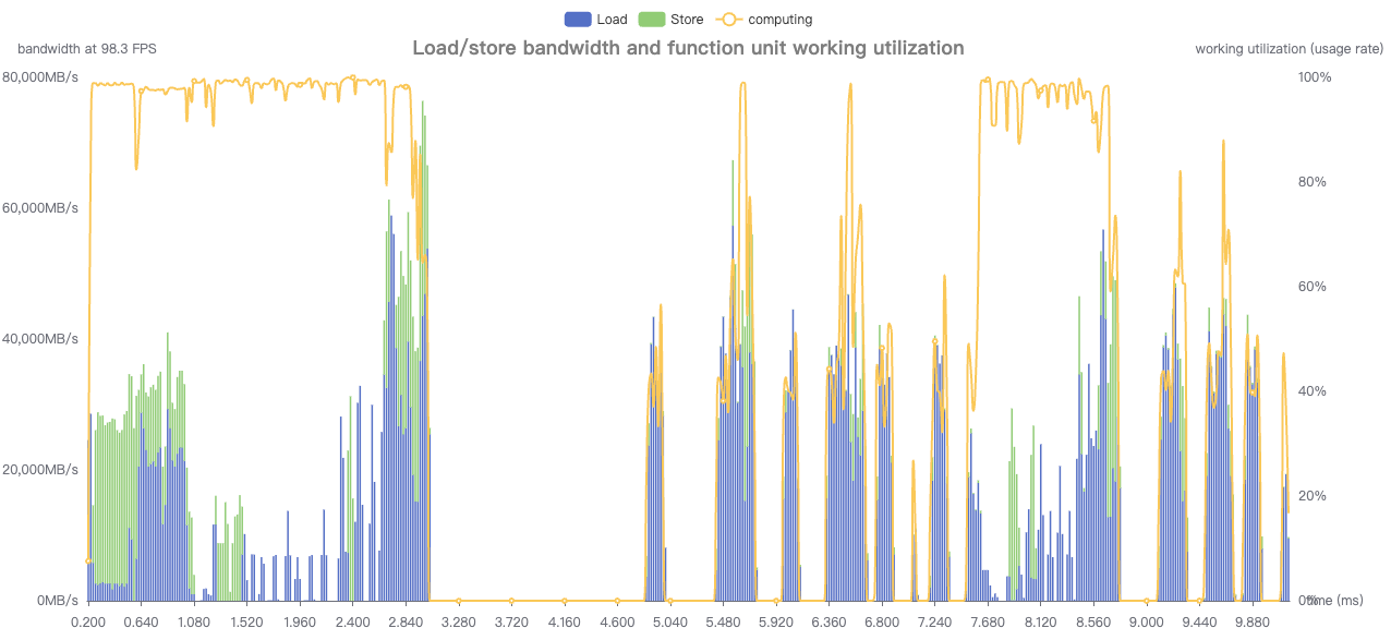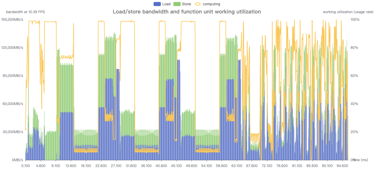 从这个图可以看到computing折线较低的地方,load store都较高,很明显是因为卡带宽导致计算受限。