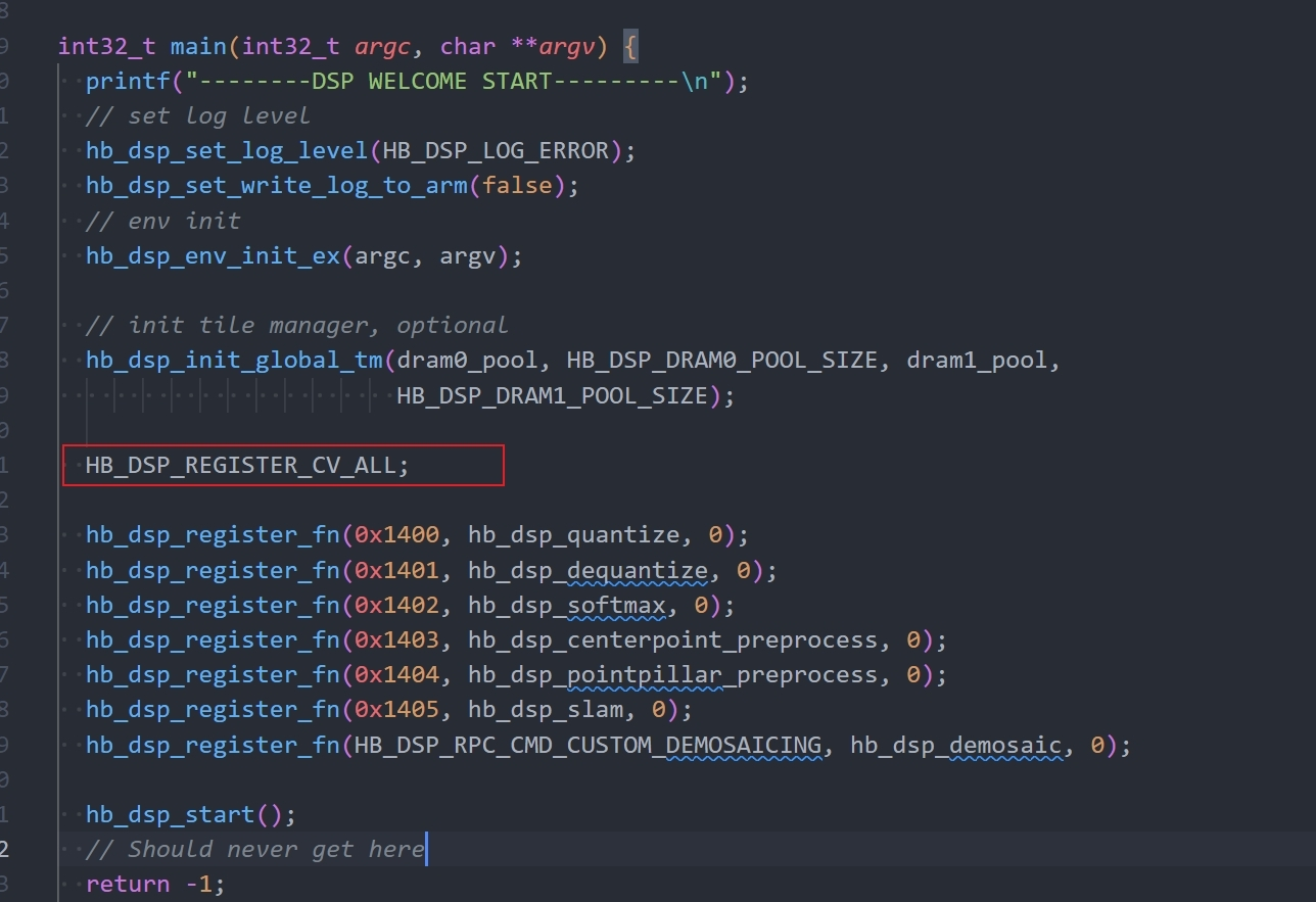 - 是否调用 HB_DSP_REGISTER_CV_ALL 宏注册官方已实现的 VP 算子,该宏定义位于 samples/ucp_tutorial/deps_xxx/ucp/plugin/dsp_plugin/hobot/include/cv/core.h