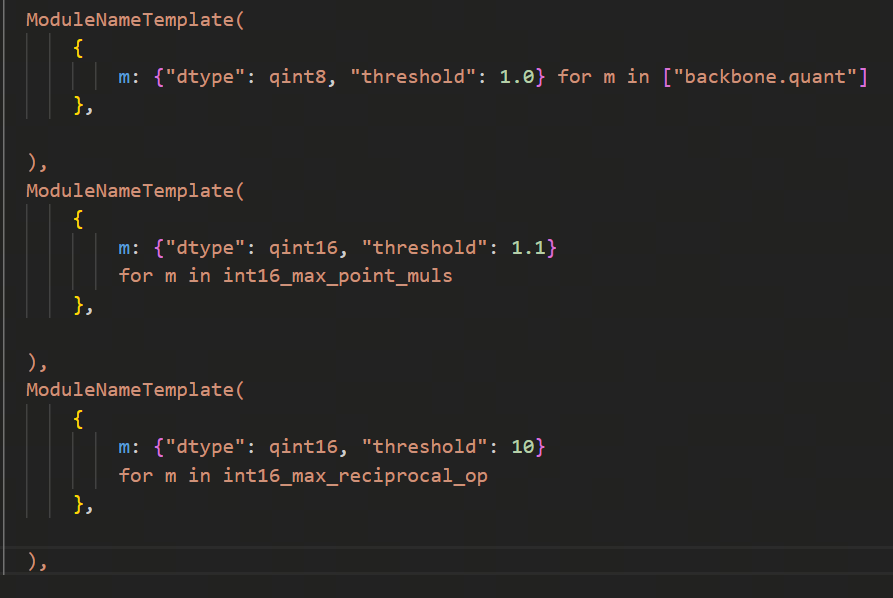 在多任务时,建议先将已知的在单任务中需要fix-scale的层(特别是具有物理意义、范围固定的op)做固定scale处理、对已知需要int16精度的算子配置高精度。例如动态单任务的fix-scale为: