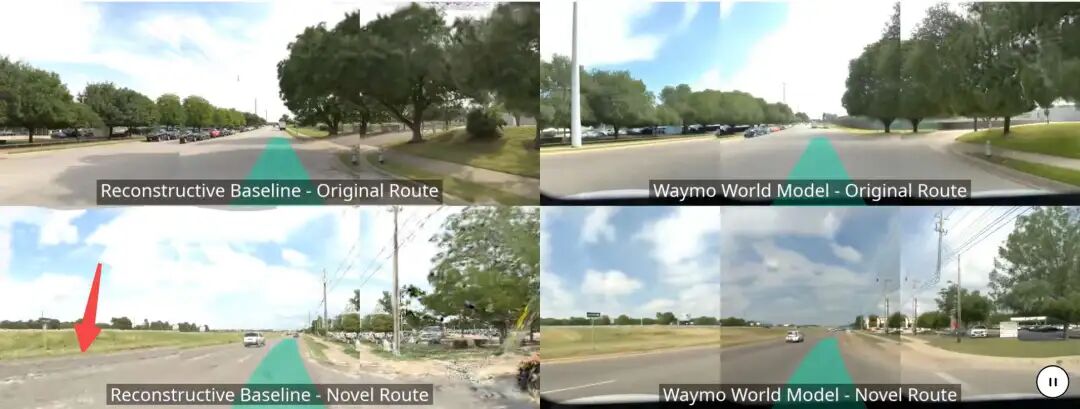 部分待仿真的场景需要更长的行驶时长才能完成,例如在窄车道中小心避让通行。这类仿真的实现难度更高,因为仿真时长越长,计算量需求越大,保持画质稳定的难度也越高。不过,基于Waymo世界模型的轻量化优化版本,我们能够在大幅降低计算量的同时,实现长时程场景仿真,且保持高真实度与高保真度,为大规模仿真提供技术支撑。