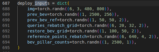 我们将J6OE包中的BEVFormer算法移植到J5的V1.1.74OE包中复现并且编译生成了hbm文件,之后在将hbm上板时出现缺少输入的报错。我注意到在config文件中有如下输入信息,但是除了img外似乎都是在算法中view_transformer模块中用到的变量,那么这部分输入在部署上板时该如何获取并传入