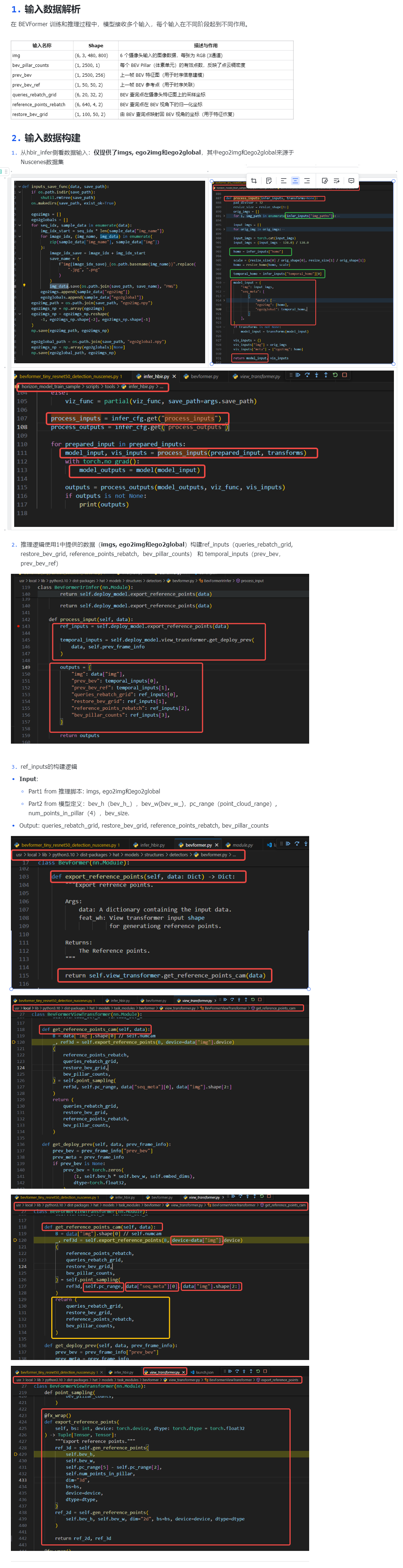 2. 上述数据与7个输入的关系是输入img由 imgs 得到,其他参数是由 imgs, ego2img,ego2global 结合 模型定义参数计算得到,部署时除了 img 和pre_bev是动态的,其他的参数都是可以提前计算后存成二进制使用的。在示例中可以将推理DEMO计算出的数据导出。