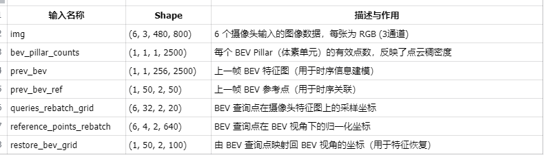 1.用户需要提供的信息包括, 提供了imgs, ego2img,ego2global,bev_h,bev_w,point_cloud_range, num_points_in_pillar,bev_size。其中ego2img和ego2global来源于Nuscenes数据集,应该可以通过相机的内外参得到。 bev_h,bev_w,point_cloud_range, num_points_in_pillar,bev_size是模型定义是的参数。
