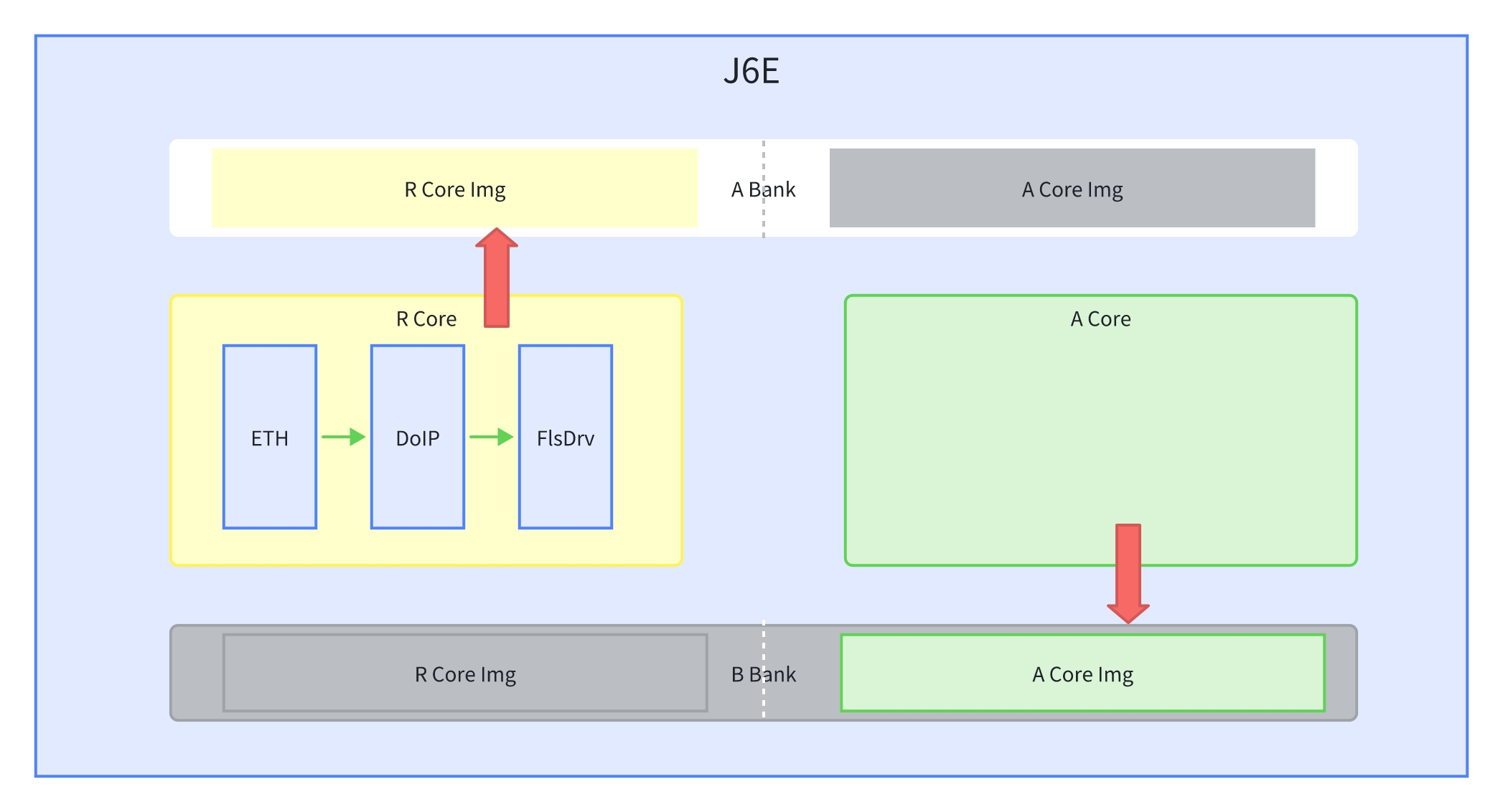 J6E这款芯片由于集成R核和A核在一块封装里面,能否实现A核与R核单独升级?比如采用AB面切换的升级方式中,