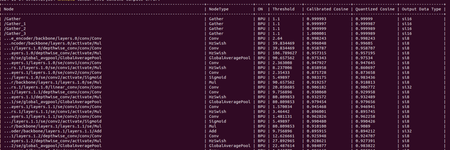 5. 问题具体描述:j6 ptq量化时打印的节点信息,中间部分算子输出数据类型为si32,如图,出现si32的原因是工具链自动判断si8量化精度不足而使用高精度量化吗?