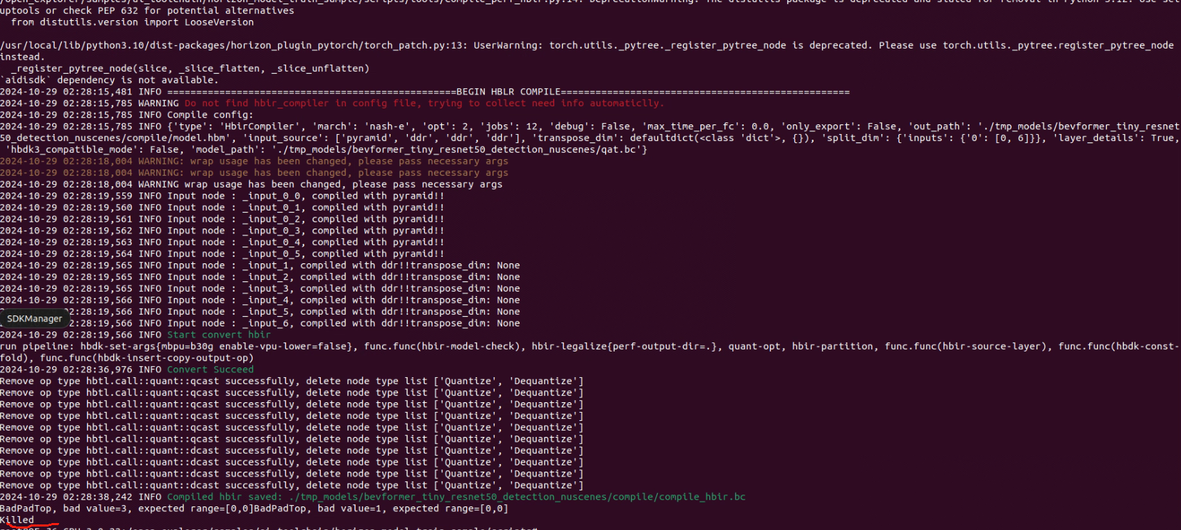 2 使用命令“python3 tools/compile_perf_hbir.py --config configs/bev/bevformer_tiny_resnet50_detection_nuscenes.py --out-dir ./ --opt 2”转换bc模型到hbm的时候,卡死了,最后进程直接被杀死,没有hbm模型生成,这是什么原因?