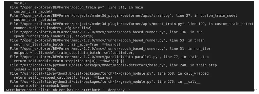 我们在calibration阶段时往模型代码里加入了一些地平线的修饰函数 from horizon_plugin_pytorch.utis.fx_helper import wrap 。然后将 model经过prepare_qat_fx函数后获得的calib_model以及model本身都没办法进行原来的浮点模型训练,训练model报错内容是:经过fx wrap修饰器修饰后的fx_dim函数参数发生了变化,1调用fx_dim(img)时报错多传入了一个参数,2调用fx_dim()时发现好像传入了默认参数BEVFormer;训练qat_model报错内容是:list不能deep copy